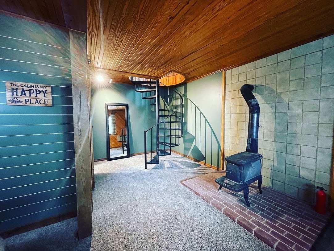 Entry leads into a combined kitchen and living area with: Full kitchen,Large sectional sofa ,50″ TV, Pub-style dining table and chairs, Wood stove, Windows offering views of the surrounding woods and White River, Outdoor deck with a 1-2 person hot tub overlooking the White River valley