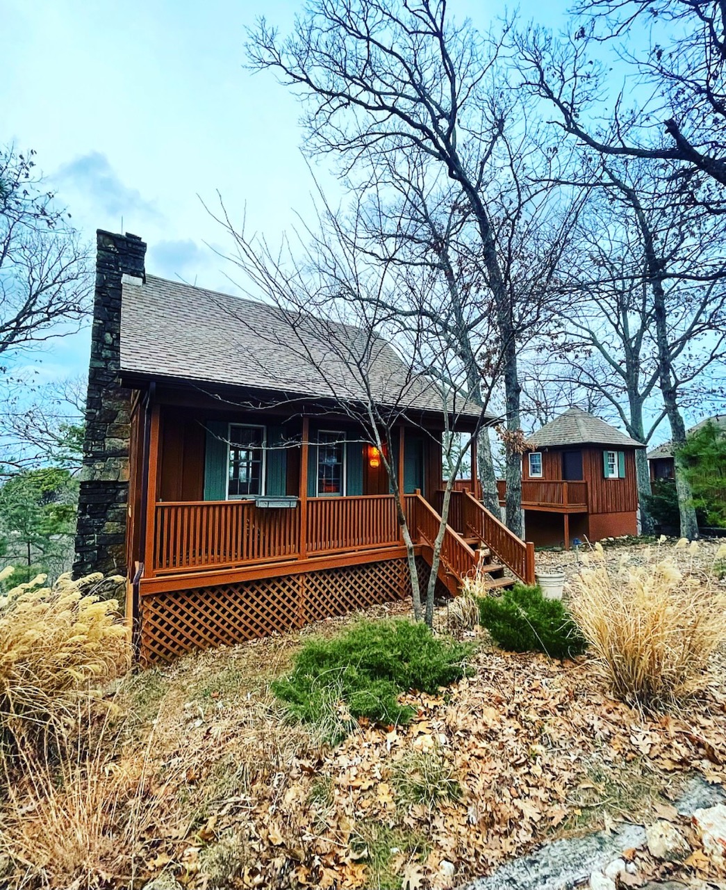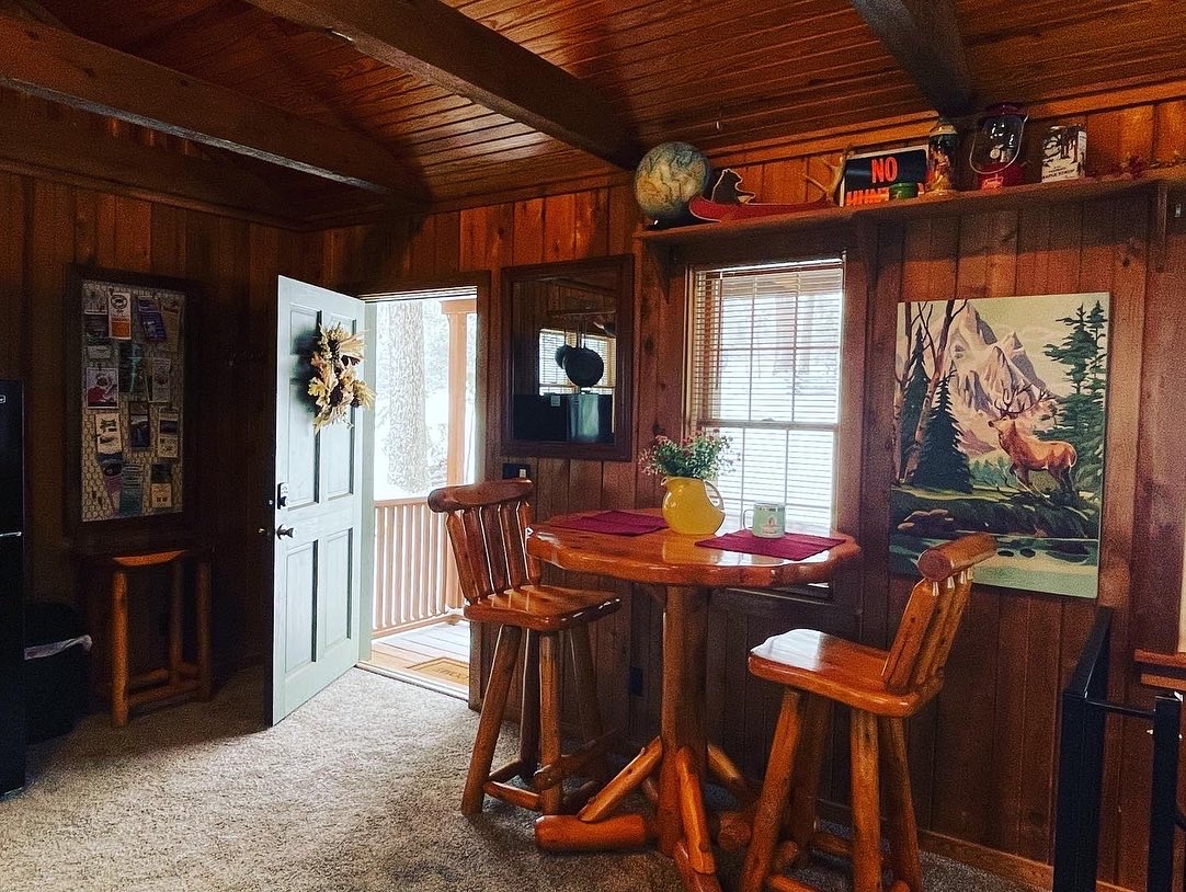 Romance awaits at Eagle Crest a luxurious two-story, one-bedroom cedar cabin with vaulted ceilings perched at the highest point of Wolf Ridge, providing breathtaking views of the White River. From the deck, you might catch a glimpse of bald eagles, known to fish in the river below.