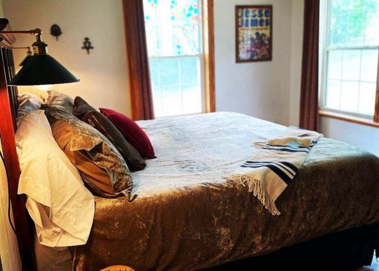 The Hideaway is a studio open floor plan with a King size bed, full kitchen with stainless appliances, living/dining area and full bath with a jacuzzi hot tub/shower combo for two. 50 inch flat screen with direct tv. The porch is screened and partially closed in for more privacy as well as a privacy fence in front of the unit. The kitchen is furnished with pots and pans, dishes and general utensils. The coffee maker is a drip style full size coffee pot and fresh roasted bear mountain coffee co. coffe is supplied.