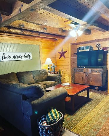 The Lodge is situated at the front of the property on 6 acres with 6 other cabins, there is plenty of wooded space to walk and Lake Leatherwood is just down the road with hiking and mountain biking trails (approximately .6 miles to the trails and it’s possible to ride out). This cabin has a steep Driveway not suitable for low profile cars.