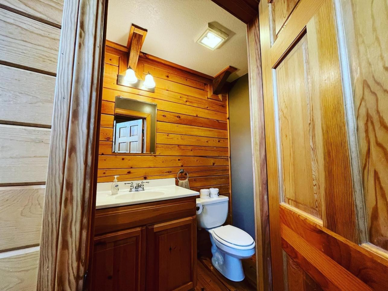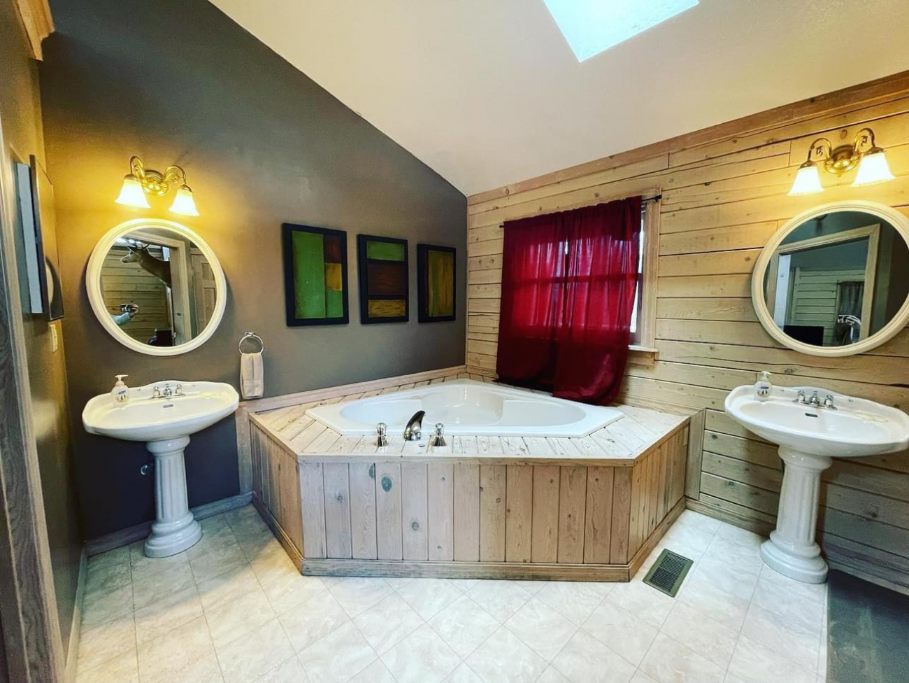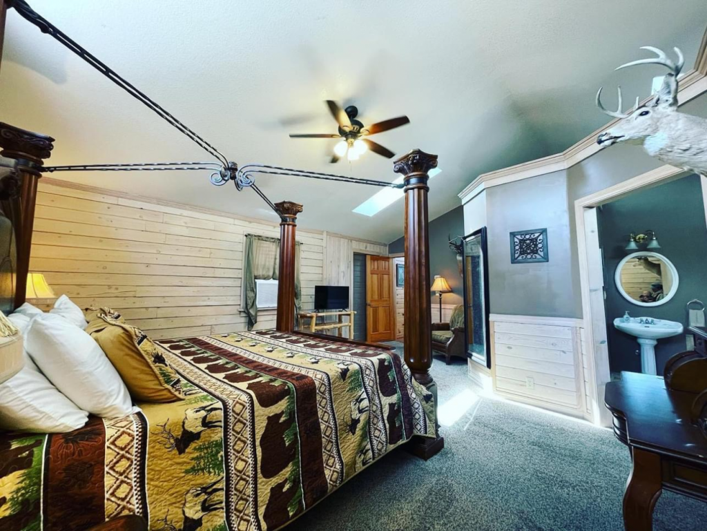 You’ll feel like royalty! Ponderosa pine walls, vaulted ceilings throughout, Large stone fireplace, Giant Jacuzzi, Huge four poster bed fit for a king or queen.